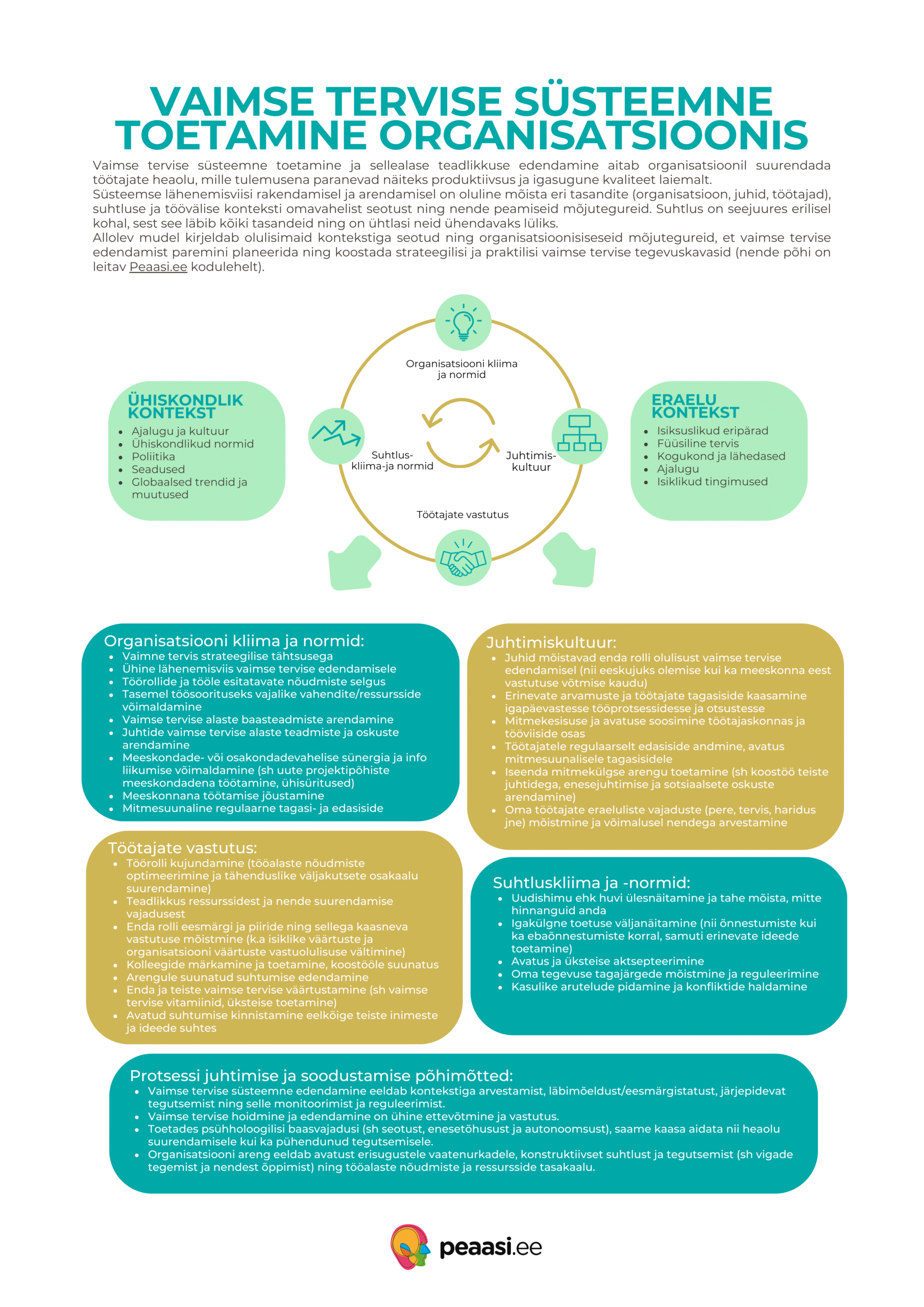 Peaasi.ee pani omalt poolt teaduslikele uuringutele ja artiklitele põhineva mudeli, mis saab tööandjat toetada, et oma töökeskkond üle vaadata ning süsteemse tegevuse tulemusena seda parendada. Vaimset tervist toetava töökeskkonna mudel on kokku pandud Kristel Kiensi (spordipsühholoog, PhD) eesvedamisel ja sisulisel tööl, teda toetasid Tuuli Junolainen ja Marja Leisk ning kogu Peaasja meeskond.